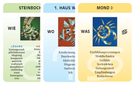 - Sie können die Karten zum lernen benutzen, indem sie einige Prinzipien aller Häuser, Planeten und Tierkreiszeichen anhand der Karten kombinieren.